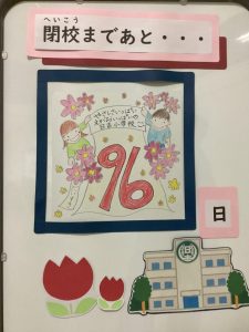 本日より、カウントダウンカレンダーを掲示しています。全校生と教職員あわせて96人。一人一枚紙に数字を書き、周りにそれぞれの思いを絵や言葉で表しました。