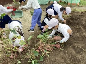 今日は、1・2年生が学級園で育てていたサツマイモ掘りを行いました。土を掘ると、中から赤茶色の立派なお芋が見えてきました。傷つけないようにそっと掘っていくと、子どもたちの掌にのらないぐらいの大きなお芋がどっさり収穫できました。焼き芋にして食べる日を楽しみにしています。