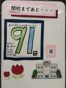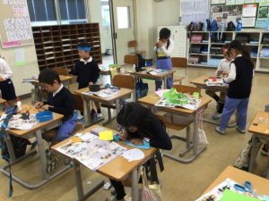 閉校まで後91日。2年生は、3・4校時の図工で「わっかでへんしん」をテーマに作品を作りました。変身したいものを考えてから、お面やベルト、腕輪になるように、色画用紙を切ってわっかにしてゴムでとめました。その後、変身したいものをイメージしながら、わっかにいろいろな飾りを付けて完成。子どもたちはかっこいい忍者や、かわいい猫、絵本の中から飛び出してきたような王様などに見事に変身。変身ごっこで盛り上がりました。