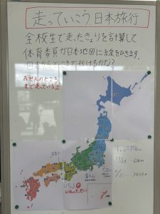 これは、全校生が走った距離を合計し、体育委員が日本地図に線を引きながら日本を縦断していく企画です。地図にはすでに赤線が引かれ、子どもたちがどこまで進んだかが一目でわかります。