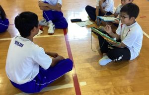 交流会では、中学校の2年生の先輩たち、北条東小学校と富田小学校の6年生と班に分かれて活動しました。