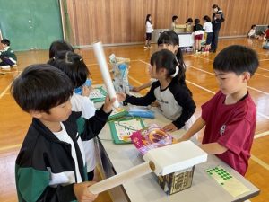 2年生は、生活科の学習「あそんで作ってくふうして」で、身の回りの材料(牛乳パック、ペットボトル、空き箱など)を使って、様々なオリジナルおもちゃを制作してきました。