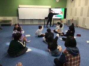 〇✕クイズ形式で、座席の譲り合いや荷物の持ち方などを楽しく学んだ後、「電車の中で自分が守りたいこと」を一人ひとりが宣言して決めました。