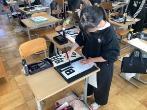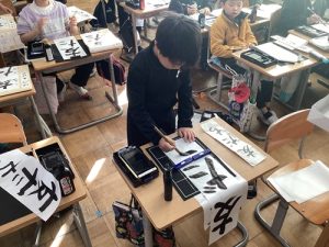 「今年は去年より上手に書きたい!」「この文字のバランスが難しいな。」と、自分自身と向き合いながら、納得の一枚を仕上げるために、書いた字を確認する姿が印象的でした。