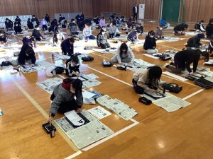 「筆を立てて、ゆっくり書いてみよう」 そんな声が聞こえてきそうなほど、集中した空気の中で「全校書き初め大会」が行われました。