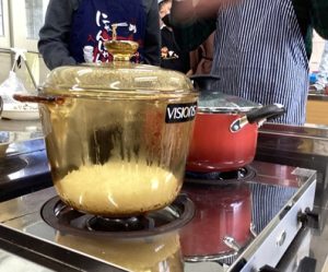 今回の献立は、日本人の食事の基本である「ごはんと味噌汁」です。 最近はスイッチ一つでおいしく炊ける炊飯器が主流ですが、授業ではあえて透明な耐熱ガラス鍋を使って炊飯しました。