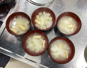 • 出汁(だし)から作る味噌汁:煮干しから丁寧に出汁を取りました。教室中に広がる香りに「いい匂い!」と。