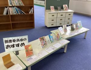 【図書委員会】図書コーナーでは、図書委員による「おすすめ本」の紹介が行われています。 本の内容や魅力を手書きのイラストとメッセージで伝える「オリジナルポップ」は、どれも力作ばかり。児童たちはそれを参考にして、「次はどの本を読もうかな?」と、手にとっています。