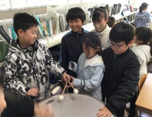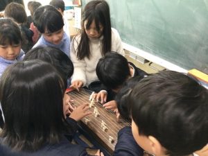 太鼓を叩いたり、琴の弦をはじいたりして、音が出ている瞬間の楽器を観察しました。