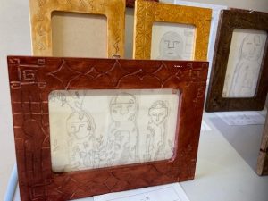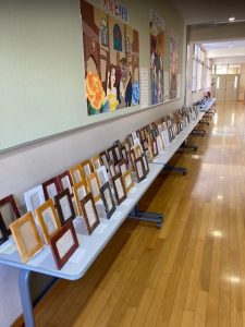 2年生は「思いを飾ろう」をテーマに、木彫で写真立てを制作しました。今は五百羅漢へ行ってスケッチした絵を飾っています。今後、自分の大切な写真を飾ってほしいと思います。