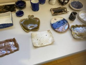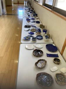 1年生は「身近に焼き物を」をテーマに、自分や家族が使う焼き物を制作しました。土練りから成形、釉薬がけまで思いをこめて作った作品はどれも味わいがあります。