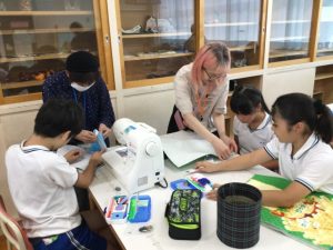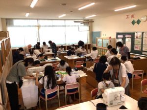 6年生は家庭科の授業で、地域の方々にご協力いただきながら、ナップサックづくりに取り組みました。針と糸の扱い方から、返し縫いや玉止めのコツまで、丁寧に教えていただき、子どもたちは一人一人が「世界に一つだけのナップザック」を完成させました。
