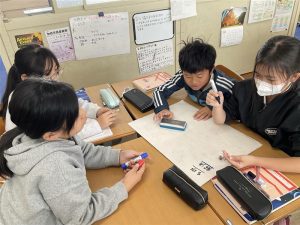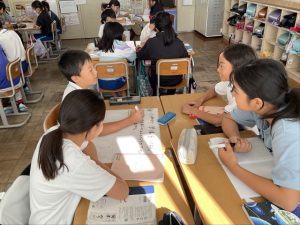 国語科「よりよい学校生活のために」の学習では、「廊下やワークスペース、階段を走っている」という課題について、解決方法を話し合いました。5年生だけでなく、全校児童の移動の仕方に目を向け、問題点を見つけ、班ごとに解決方法を考えました。どの班も、課題をよりよくしようという意識をもって、真剣に話し合いに取り組む姿が見られました。
