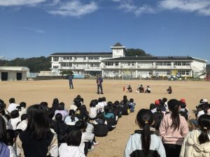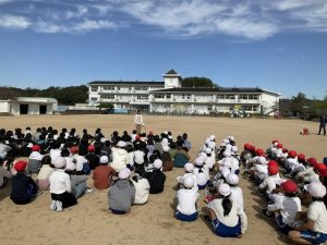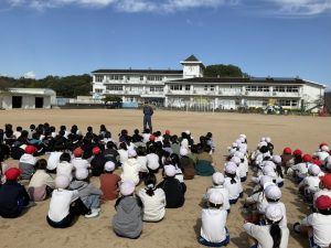 今回の避難訓練は、1階の理科室から火災が発生したことを想定して行いました。校内にサイレンが鳴り響くと、みんな動きを止め、次の放送に集中しました。その後先生の指示に従って、できるだけ安全な避難経路を通って素早く運動場へ避難しました。少年消防隊による報告からは、「素早く避難できていたが、少しおしゃべりが聞こえていた。」「ハンカチで口を押えていない人がいた」などの指摘がありました。また、消防署の方からは、消火器の仕組みや消火器の使い方を教わりました。家事を発見するとすぐに知らせることが大切であることも教わりました。いざというときに自分や友達の命を守れるよう、99点ではなく100点満点の避難訓練ができるよう心掛ける必要があります。