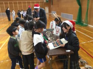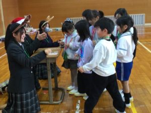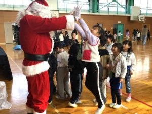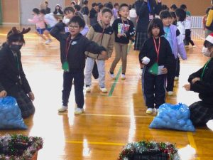 12月23日(火)に、北条高校の生徒と一緒にクリスマス会を行いました。五百羅漢や気球など、加西市の魅力が伝わるクリスマスの人形劇を見たり、英単語のクイズに答えたりしながら、高校生と交流を深めました。サンタクロースが現れたときには、子ども達も目を輝かせており、元気いっぱい楽しみながら活動に取り組むことができました。