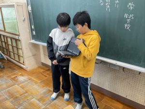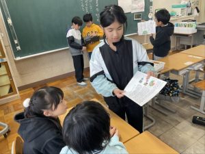 国語科「自然環境を守るために」の学習で作った提案文を4年生に説明しました。今地球で起きている環境問題に対して自分たちができることについて、資料を示しながら説明しました。相手が見やすいように資料を見せながら説明したり、見てほしい部分を指差ししたりするなど、相手意識をもって説明することができました。