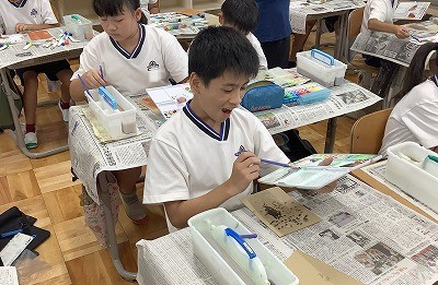 写生会に向けて、5年生が、図工の時間に色づくりを行いました。パレットに色の仲間をたくさん作り、自分だけの木や岩の色を塗りました。できた作品は、ホワイトボードに貼り、友だちとお互いのよさを見つけ合いました。