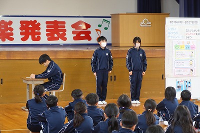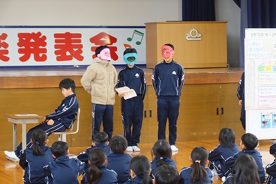 児童朝会 児童朝会を行いました。校長先生からは、「相手のことを考えて伝えること」。保健委員会からは、「正しい姿勢を意識して生活すること」。学校代表からは、「お世話になった校舎に感謝の気持ちをもって掃除すること」のお話がありました。残り1か月、いいおわり方ができるように、全校生で取り組んでいきます。 未分類 2026年2月18日 « 長縄大会(高学年) サイエンスショー »
