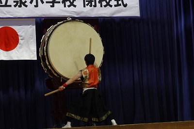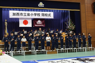 泉小学校の閉校式を行いました。オープニングでは、山田純平さんによる和太鼓演奏や小野高等学校書道部による書道パフォーマンスを行いました。学習発表では、4年生の三味線に合わせて会場のみんなで校歌を歌いました。5年生は、校章や校歌の意味について調べたことをもとに作ったカルタを劇と呼びかけで発表しました。6年生は、6年間での自分の学びを動画やスピーチにして発表しました。最後には、会場みんなで泉小の校歌を歌いました。たくさんの思い出を胸に、新しい「はじまり」へ。忘れられない1日となりました。