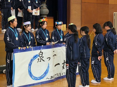 6年生を送る会 6年生を送る会を行いました。「みんなで」というスローガンを大切にしながら、泉小クイズや校歌・校章カルタを全校生みんなで楽しみました。また、これまで先頭に立ってがんばってきた6年生に感謝の気持ちを、劇や歌、プレゼントで在校生みんなで伝えました。体育館いっぱいに広がった拍手と笑顔。「みんなで」つくり上げたからこそ生まれた一体感。学年をこえたつながりの温かさを改めて感じる、すてきな送る会となりました。 未分類 2026年2月27日 « 閉校式