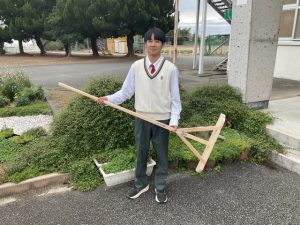 昨年度、本校を卒業した村上君が、高校の授業で製作したトンボを寄付してくれました。村上君は『人が喜ぶ家をつくる大工になる』という夢をもち、東播工業高校に入学し、勤勉に励んでいます。このトンボはそんな村上君が入学して初めて作った作品であり、彼の温かさや誠実さが詰まったものになっています。先輩の思いを受け取り、大切に使わせていただきたいと思います。