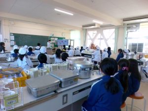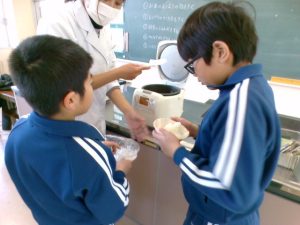 はじめに、栄養教諭の先生からお米の栄養についての話を聞きました。お茶碗1杯分のお米を食べることでたくさん運動できることや、お米の腹持ちの良さなどを教えてもらい、初めて知る情報に驚きの表情を見せていました。