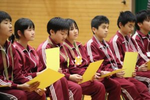 終盤には、1~5年生が作ったプレゼントを6年生に渡したり、いきものがかりの「ありがとう」を合唱したりして、みんなで感謝の思いを伝えました。