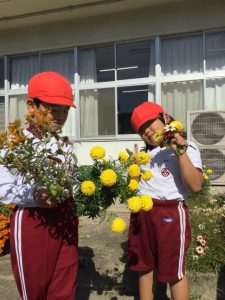 夏から秋にかけて、富合小学校南校舎入口の花壇の花が色鮮やかに咲き、子どもたちの日々の生活を見守ってくれていました。自分たちの学校生活を彩ってくれた花を、今度は花束にしてお家の人にプレゼントしようと子どもたちは動き出しました。