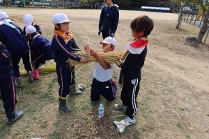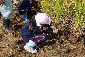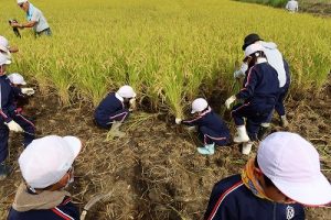秋晴れの空の下、3年生が稲刈り体験をしました。