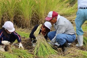ワッショイさんと窪田町の営農組合の方々に教えていただきながら、鎌を使って一株一株丁寧に刈り取っていきます。