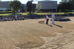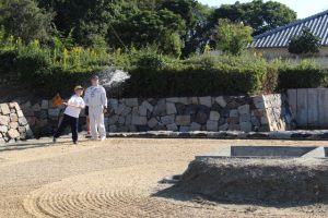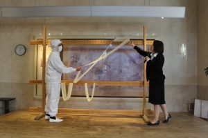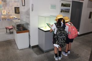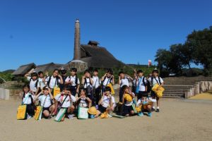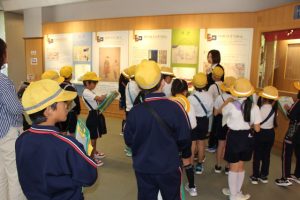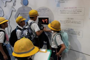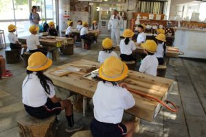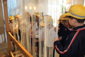 まず最初に向かったのは、たつの市にある「そうめんの里」。「揖保乃糸」のそうめんが、どのように作られているのかを見学しました。 細いそうめんを伸ばす職人さんの技に、「えー!すごい!」と歓声が上がりました。伸ばしたそうめんを触らせていただき、そうめんの強さにみんな驚きでした。 歴史資料館では、そうめんを作るための昔の道具や歴史についても学び、そうめんが手作業で作られていたことの大変さや伝統を知ることができました。最後はおいしいそうめんを試食させていただきました。