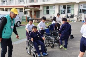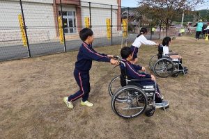車いす体験では、運動場や駐車場に作られたコースを進みます。 「まっすぐ進むのが難しい」「小さな段差でも止まってしまう」 と、思うように操作できないもどかしさを感じている様子でした。