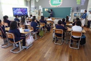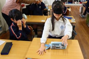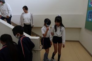 アイマスク体験では、二人一組になり、一人が目隠しをして、もう一人が介助役となって校舎内を歩きました。 「目からの情報が全く入ってこない」「友達の声を頼りに歩くのが不安だった」「怖かった」 普段とは違う状況に、不安や怖さを口にする富田っ子も多くいました。