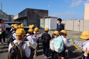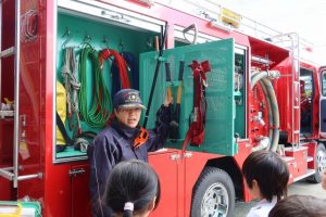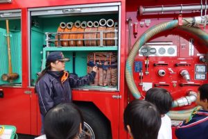 次に見学したのは消防署です。消防署では消防車の設備多さに驚き、みんな興味津々で質問をしました。早着替えのデモンストレーションも見せていただきました。30秒ぐらいであっという間に着替える様子にみんな驚きでした。