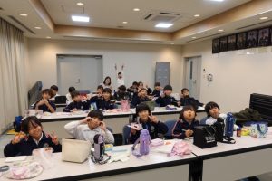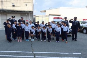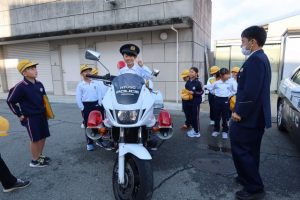 まず初めに見学したのは警察署です。警察の方が持っている様々なものを見せていただき、みんな興味津々でした。また、パトロールカーや白バイの装備を見たり実際に乗ったりと貴重な体験をさせていただきました。神戸の警察署との無線での通信にはみんな静かに耳を傾け聞いていました。