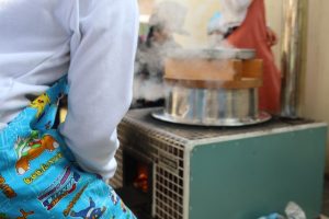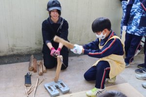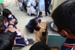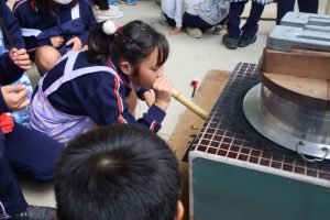 みんなでお米を研いだり、ご飯を炊くときに使う木を切ったり、また竹筒を使い息を送ってかまどの火を大きくする体験もさせていただきました。