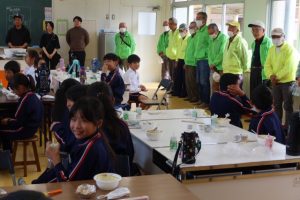 連合婦人会の方が作ってくださった、ハンバーグ・おひたしと一緒においしいごはんを味わいました。そのあとはご飯の上にカレーをかけて食べました。