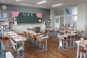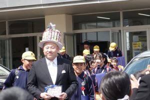 式後の学級の時間、在校生たちの温かな見送りを受けて校門を出た子どもたち。