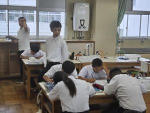 理科では実験を通して、個体が液体になるときの融点の様子について学習しました。生徒は、手際よく各班で実験準備を行い、スムーズに実験を進めることができていました。考察の時間も十分にとりながら、授業を組み立てることができていました。