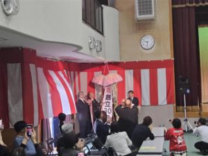 本年度は創立30周年であり、開会式(記念式典)では記念のくす玉が割られました。くす玉は、枠からすべて手作りで、本校教諭と本校2年生が協力して作成しました。本番にきちんと割れるかどうか不安もありましたが、無事にきれいに割れ、会場からも歓声が上がっていました。