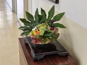 今日の職員室前の生花を遠くから見て、近づくと・・・。