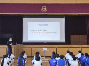 今日の授業の目標は『心停止を目撃した時に「自分にできることは何か」を知る』でした。講習会では映像を見ながら、一つ一つの動作を丁寧に、実際に人が倒れたときのやるべきことをトレーニング人形を使いながら練習しましたが、知識や技術として「わかる」ことと実際に行動「できる」こととはまた違う部分もあります。そんな中、中学生として「私」を主語にして「自分にできることは何か」を考えることの大切さを学ぶ時間となりました。