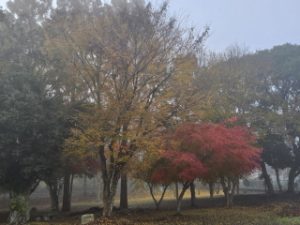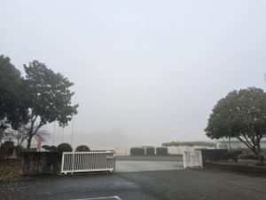 職員駐車場からグラウンドを見ても、全体的に霧がかかっており、先の見通しが効きにくい状況です。自動車で通勤していても、ヘッドランプやフォグランプを点灯している車も多く見られました。