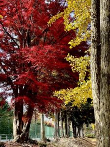 体育館と県道の間の木々の様子です。このような四季を感じることができる善防中学校の環境はやはり素晴らしいですね。