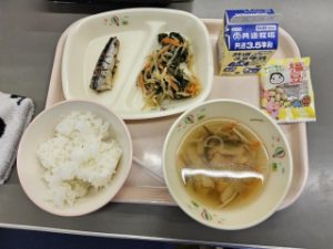 本日のメニューは、ごはん、牛乳、鰯(いわし)の生姜煮、ほうれんそうのおかか和え、すまし汁、節分豆です。