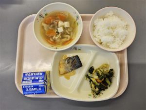 献立は、ふっくらと炊き上がったごはん(有機米)、牛乳、さばの味噌煮、けんちん汁、そして白菜のおひたしです。素材には、地元加西産が使われています。主食のごはんは加西市産の有機米、けんちん汁の里芋やネギ、おひたしの白菜もすべて地元の加西で大切に育てられたものです。