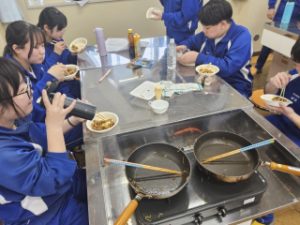 昨日3月4日の3年生は、あいにくの雨だったため、学年活動として調理室で「焼きそば作り」を楽しみました。写真にあるように、仲間と協力しながらフライパンを囲む姿は、受験の緊張から解き放たれ、中学生らしい弾けるような笑顔に溢れていました。自分たちで作った出来立ての味は、きっと一生忘れない「仲間の味」になったことでしょう。